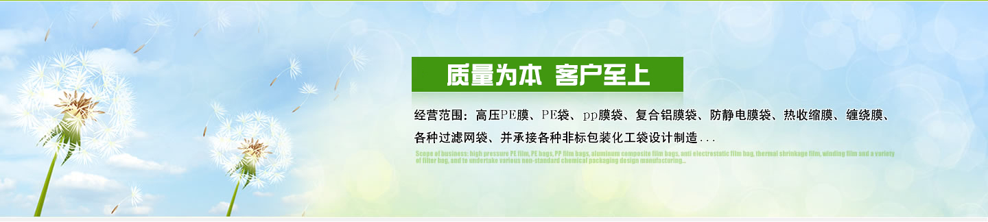 經(jīng)營(yíng)范圍:高壓PE膜、PE袋、pp膜袋、復(fù)合鋁膜袋、防靜電膜袋、熱收縮膜、纏繞膜、各種過(guò)濾網(wǎng)袋、并承接各種非標(biāo)包 裝化工袋設(shè)計(jì)制造。歡迎各地客戶來(lái)我公司洽談,共創(chuàng)宏圖之志。